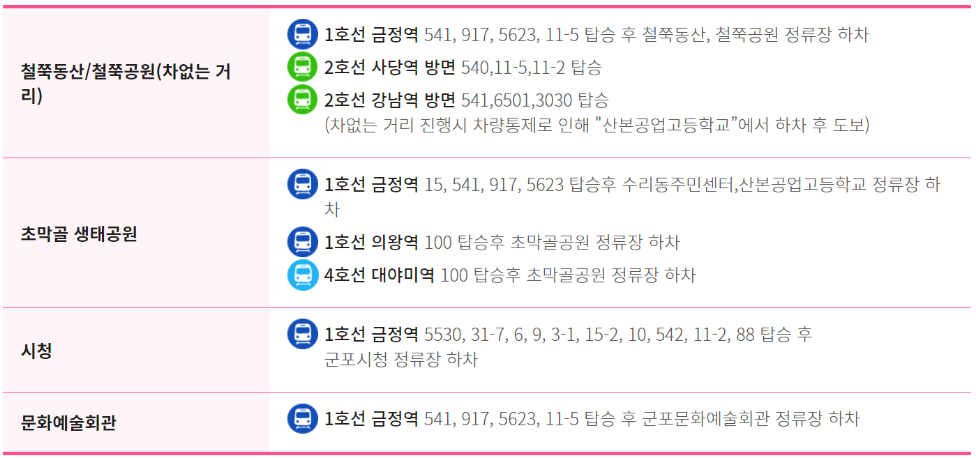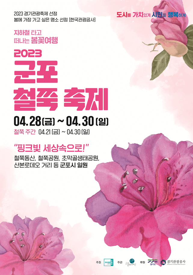 군포 철쭉 축제는 지하철을 타고 떠나는 봄꽃 여행으로 경기도 군포시에서 열리는 연례행사로 이 축제는 매년 4월에 열리며 도시의 산과 언덕이 철쭉꽃으로 뒤덮입니다. 축제는 일반적으로 며칠 동안 지속되며 퍼레이드, 음악 공연, 한국 전통문화 공연, 음식 가판대 및 불꽃놀이와 같은 다양한 이벤트와 활동을 제공합니다. 아름다운 철쭉정원에서 산책과 사진 촬영도 즐길 수 있어 축제의 하이라이트입니다. 군포 철쭉 축제는 도시 군포에서 여러분의 봄은 한 편의 소중한 추억을 만들어 드립니다.