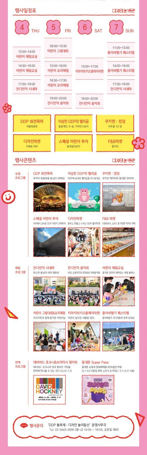 ▣ 행사구성 : DDP회전목마, 잔디언덕, 시네마&음악회, 어린이체험교실, 어린이 그램대회&요리체험, 카마키마(키즈플레잌마켓), 종이비행기 페스티벌, 이상한 DDP의 벨리곰, 쿠키런: 킹덤(포토존 및 퍼레이드), 스페셜 어린이 투어, 디자인마켓, F&B마켓